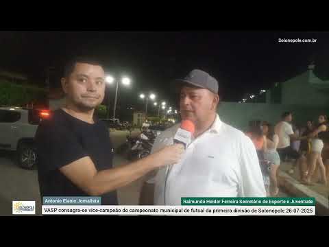 O Secretário de Esporte e Juventude Raimundo Helder Ferreira parabenizou os dois times finalistas do campeonato municipal de futsal da primeira divisão de Solonópole no interior do Ceará nesta noite de sábado, 26 de julho de 2025, no ginásio poliesportivo José Atualpa Pinheiro Landim. Solonopole Futsal campeão e, o Vasp vice-campeão.